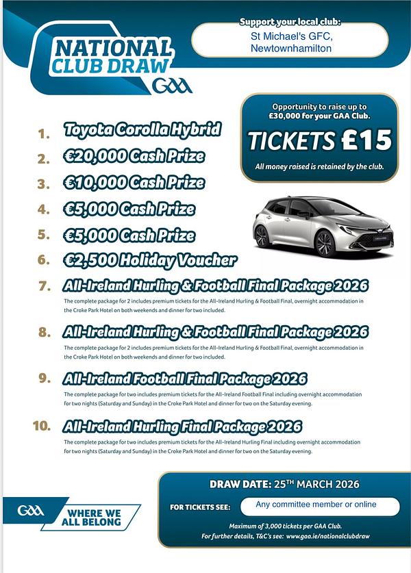 Purchase a ticket to support your club & you could be in with a chance of winning some incredible prizes including a brand new Toyota Corolla Hybrid Car as first prize, exciting weekend packages to the thrilling All-Ireland Finals, a holiday voucher worth €2,500 & many more. 🔵⚪️