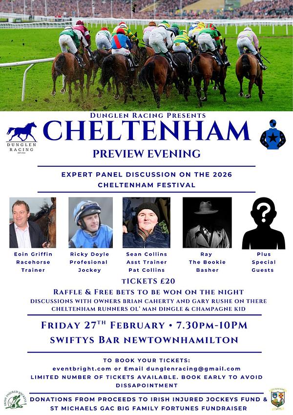 We'll let the experts do the talking, as Eoin Griffin (racehorse trainer), Ricky Doyle (professional jockey), Sean Collins (Assistant trainer), Ray The Bookie Basher join some other special guests for a special Cheltenham Preview Evening.